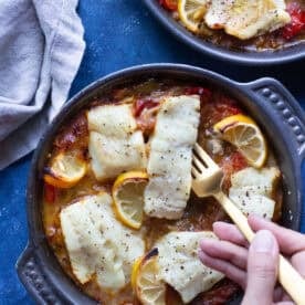 This pan seared cod is cooked in a flavorful shallot, fennel and mushroom sauce and served with some dill rice. This simple cod recipe makes the perfect dinner is less than one hour.