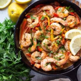 This Mediterranean style shrimp recipe is bursting with vibrant flavors. Large shrimp marinated with spices, garlic and olive oil, then cooked in a delicious tomato and pepper sauce results in one of the tastiest 20-minute dinners you'll ever find!
