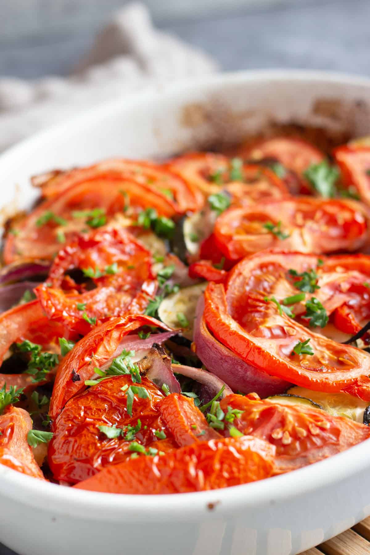 Briam is a Greek roasted vegetables dish cooked in olive oil. This easy and delicious recipe is made with just a few ingredients and is vegan, low carb and gluten free.