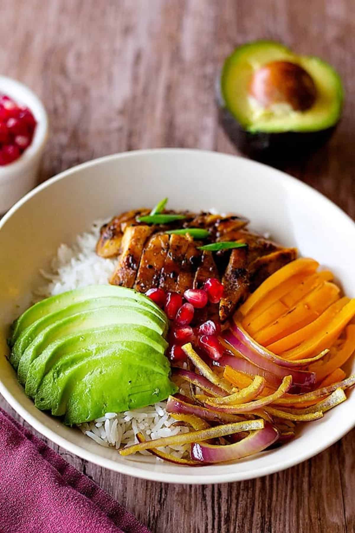 - Divide the rice between two bowls, top with chicken, onion, pepper, pomegranate arils and avocado.