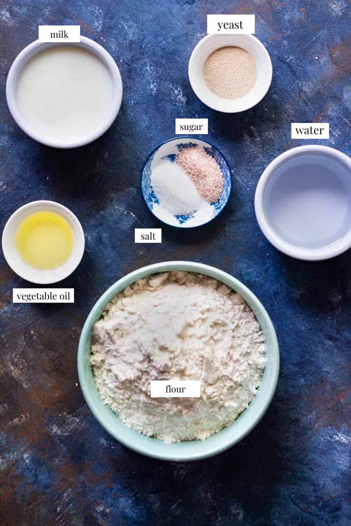 - Water and milk: Warm water and milk are the liquid part of this recipe. I use a combination of milk and water to make sure the dough is supple and soft and the flavor is perfect. It’s important the the milk and water are not too hot as it would kill the yeast or too cold and the yeast wouldn’t bloom. You can use 2% or whole milk.