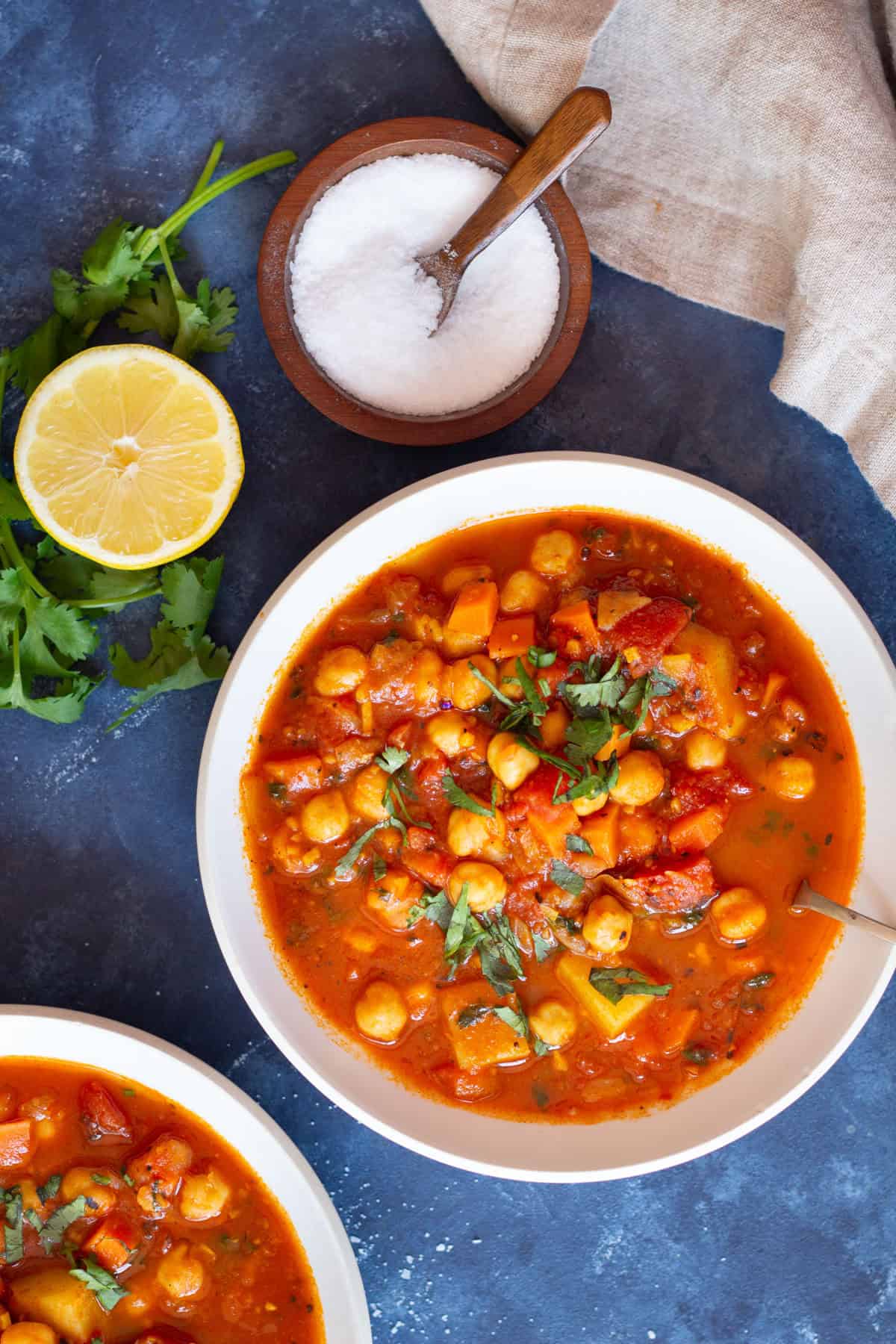 Canned tomatoes and chickpeas: Using canned tomatoes and chickpeas adds great flavor and texture while cutting the cooking time. You can prepare this stew in less than an hour.