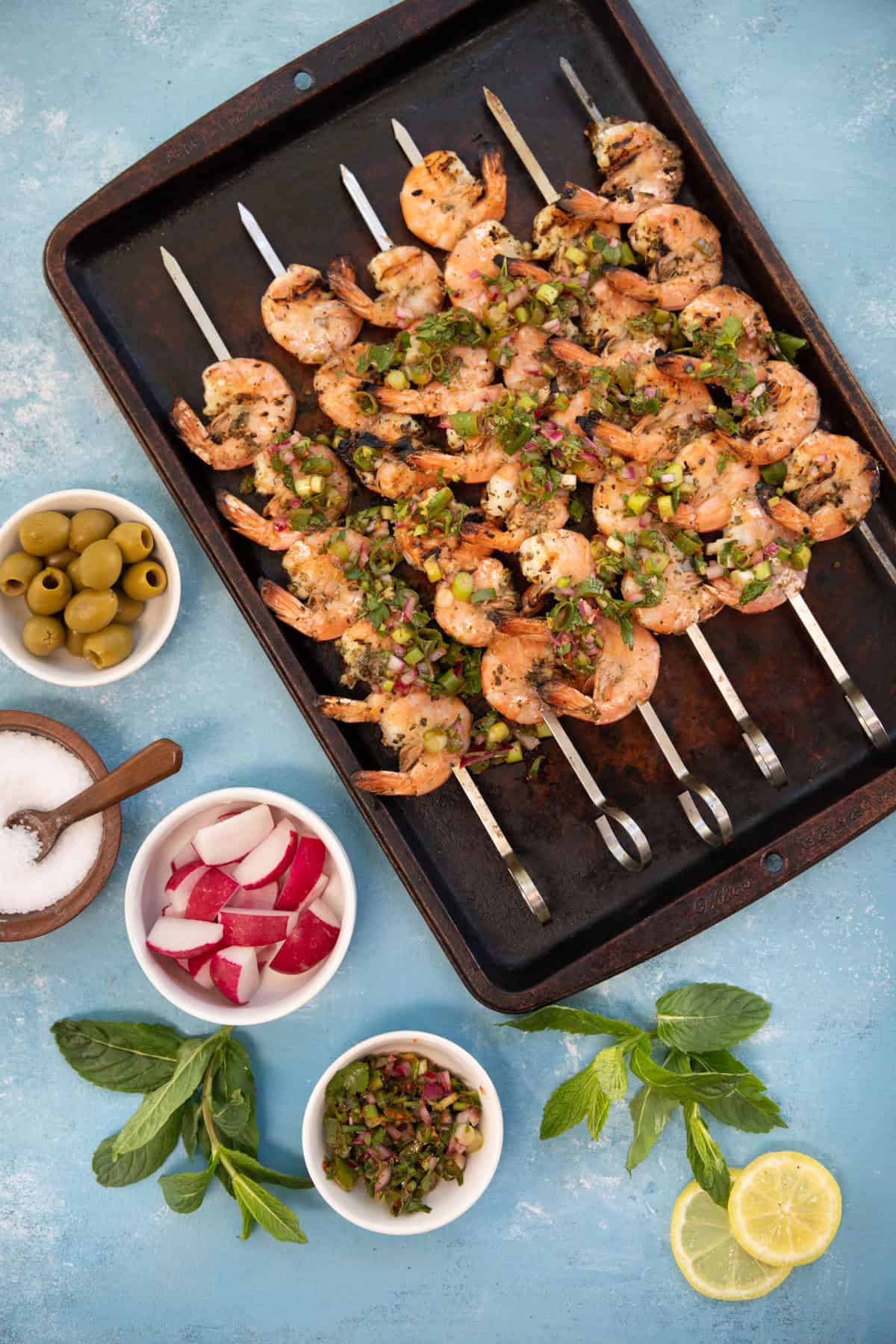 Serve these grilled shrimp skewers with grilled asparagus or Mediterranean grilled vegetables. You can also serve them with Mediterranean salad, summer lettuce salad, white bean salad, green bean salad or even green goddess salad.