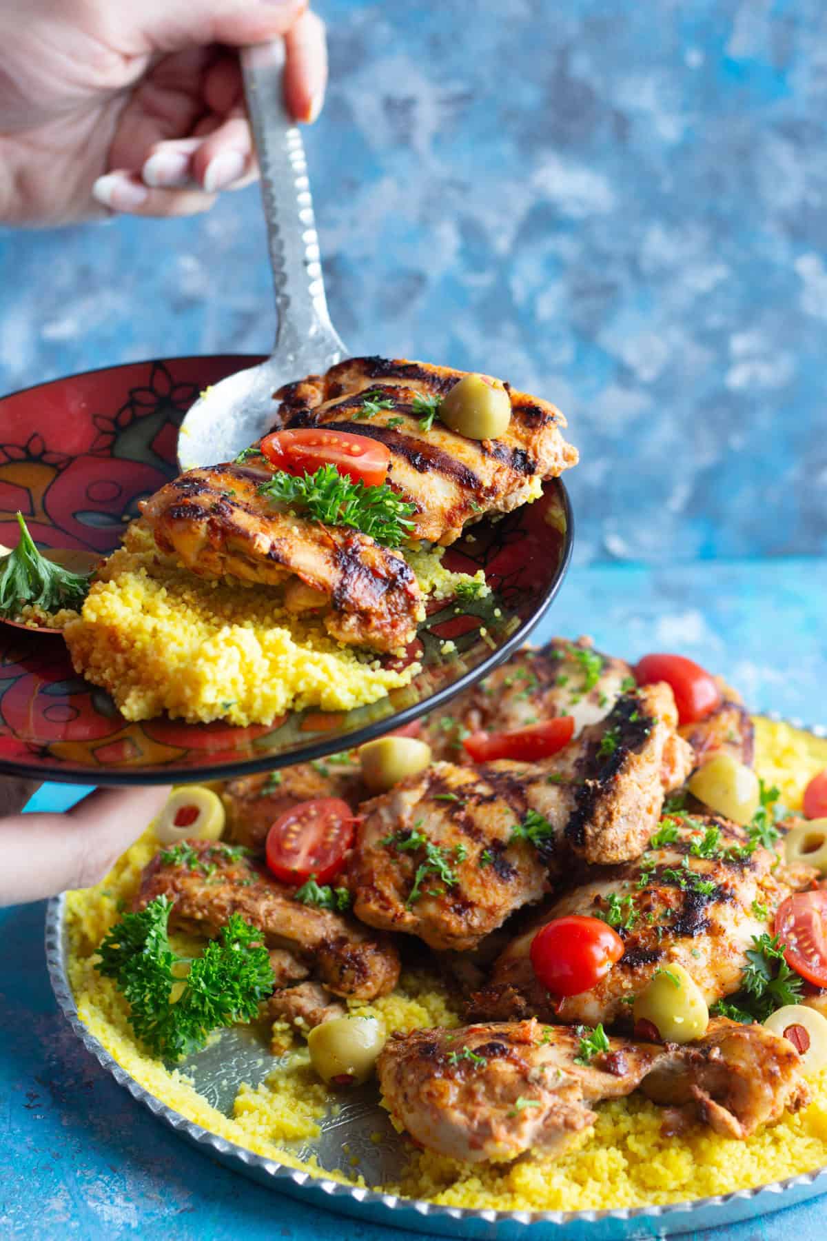 Grilled chicken flavored with harissa and served with a delicious couscous is very simple to make. You can serve this recipe as a family meal or at your party. Because of the presentation and colors, this harissa chicken dinner is indeed a showstopper. I love serving this dish family style, meaning that I serve all of the couscous and chicken in one large platter and everyone takes as much as they like into their plates.