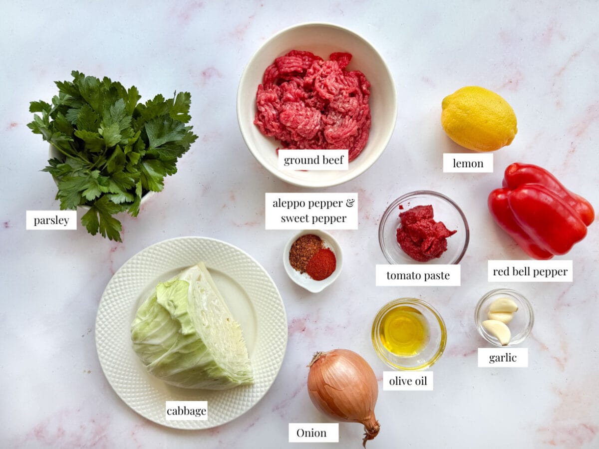 Gather your ingredients: Kapuska call for ingredients you most probably have on hand, olive oil, onion, red bell pepper, garlic, ground beef (or ground lamb), tomato paste, Aleppo pepper, sweet chili pepper or paprika, salt, cabbage, water, lemon juice, and parsley.