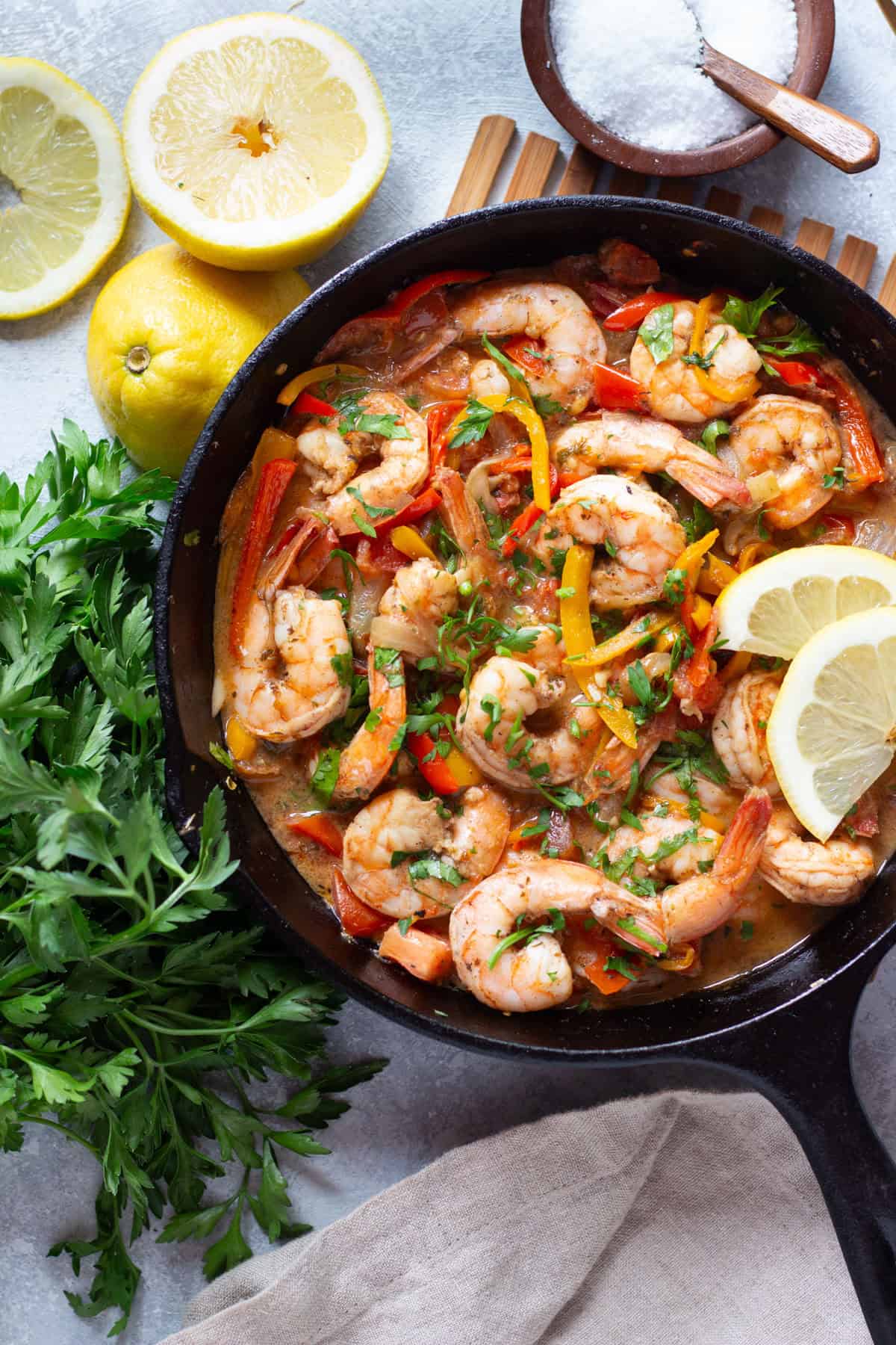 This Mediterranean style shrimp recipe is bursting with vibrant flavors. Large shrimp marinated with spices, garlic and olive oil, then cooked in a delicious tomato and pepper sauce results in one of the tastiest 20-minute dinners you’ll ever find!