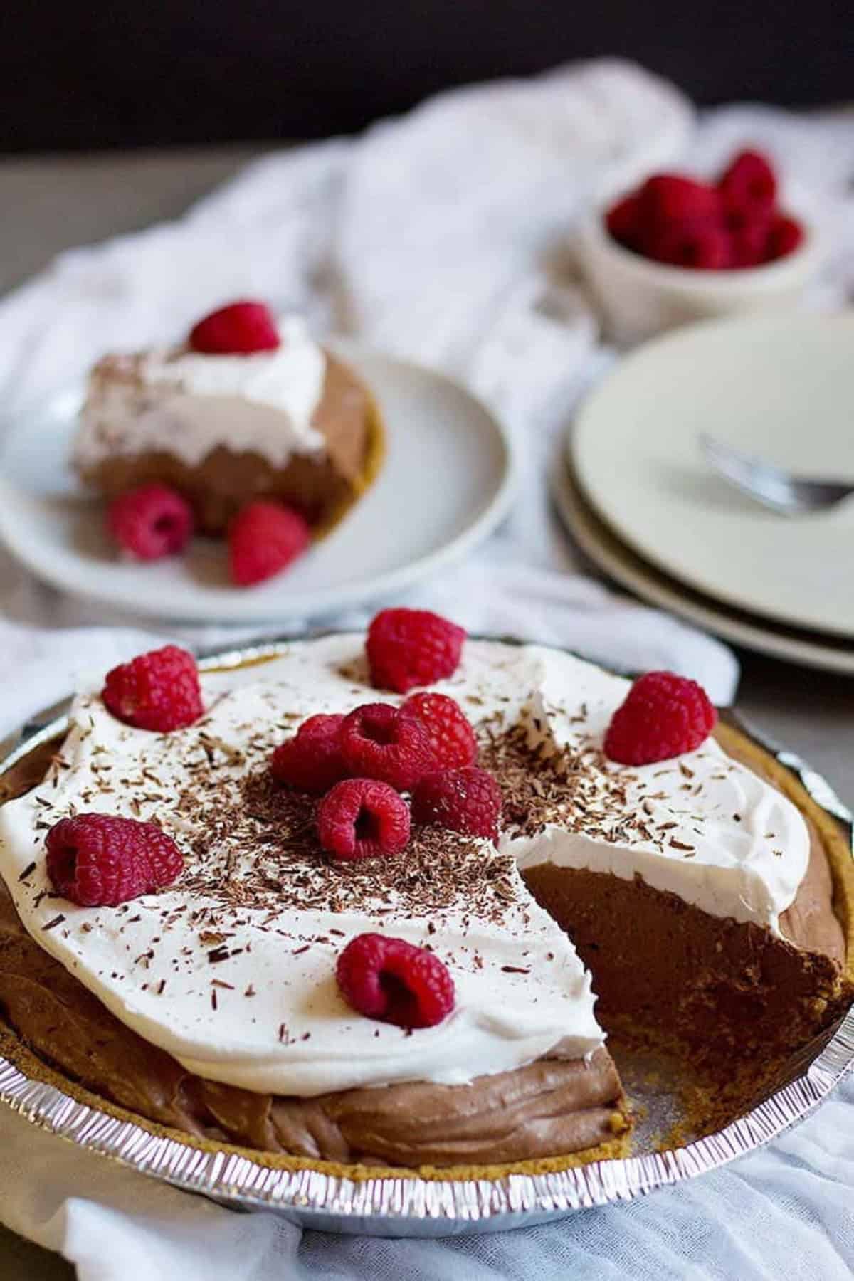 You can top this no bake chocolate cream pie with cool whip or whipped cream and some fresh fruit. I used raspberries but strawberries and blueberries would be perfect, too!