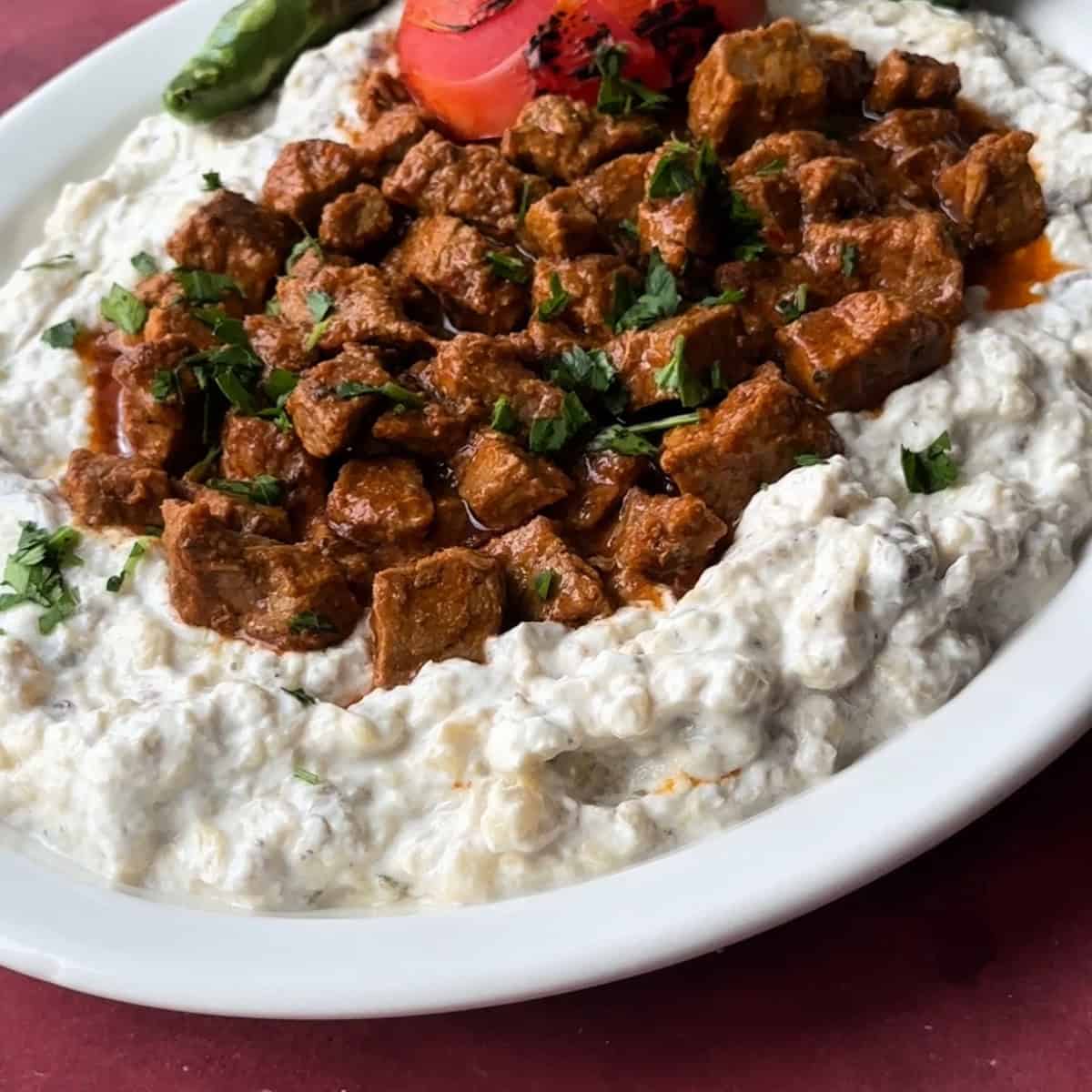 This delicious Turkish dish has two main components. The first layer is smoked eggplant mixed with yogurt. The eggplant is charred over an open flame, similar to the method used for mutabal or baba ghanoush, then combined with thick yogurt. The second layer is tender lamb, stewed in a tomato based sauce with a few warm spices. Together, they create a deeply flavorful combination that has been loved for generations.